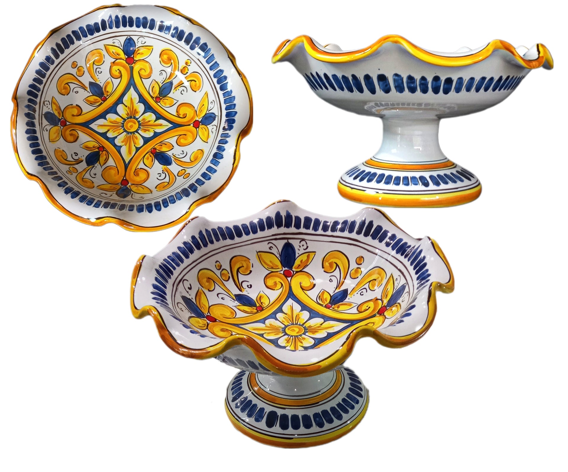 Valorizza il tuo tavolo con l'alzata forgiata a mano. Decorata: con decori geometrici, rosone e giglio siciliano, questo centrotavola di Caltagirone aggiungerà un tocco di classe alla tua tavola.