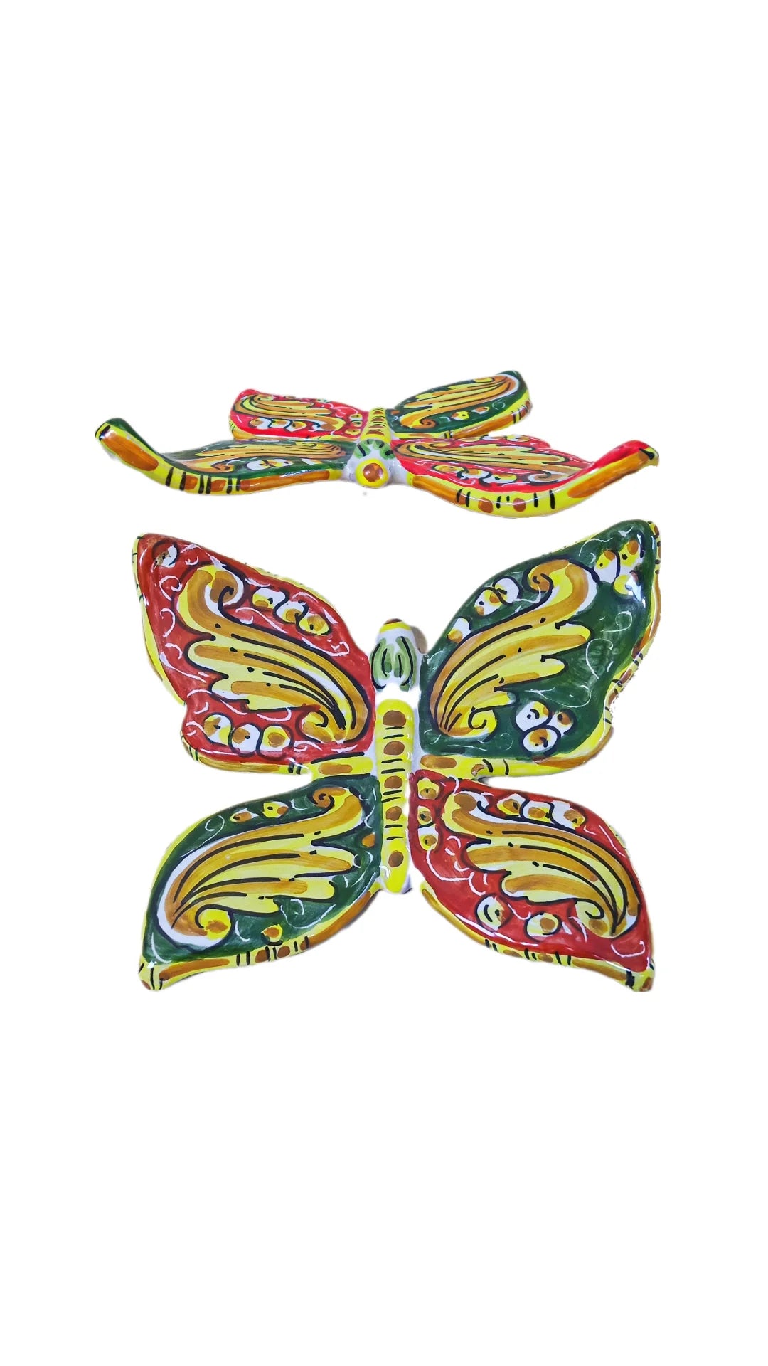 Farfalla di Caltagirone, la bellezza della maiolica si unisce a decori di Fico d'India, foglie di acanto e fiori. Aggiungi un tocco di eleganza e tradizione made in Italy alla tua casa con questa farfalla unica.